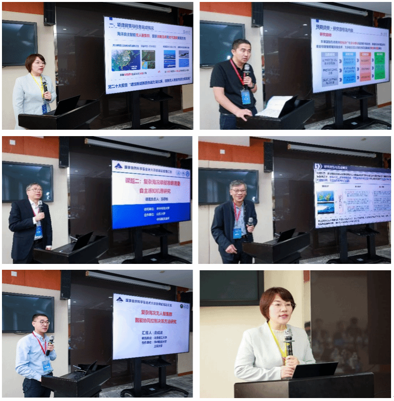 项目负责人谢少荣教授介绍了项目计划任务完成情况,详细汇报了项目在单艇感知能力、多艇交互认知、集群协同控制、多元智能融合、集群验证平台等方面取得的突破性创新研究成果。山东大学张伟教授、华中科技大学苏厚胜教授、中国科学院沈阳自动化研究所唐延东研究员、北京理工大学俞成浦教授、上海大学谢少荣教授分别汇报了该项目五个课题“复杂海况下海洋环境智能感知方法研究”、“复杂海况单艇准确完备自主感知机理研究”、“复杂海况多艇实时交互认知机制研究”、“复杂海况无人艇集群智能协同控制决策方法研究”与“复杂海况典型无人艇集群应用验证平台研究”的结题研究情况与取得的研究成果。