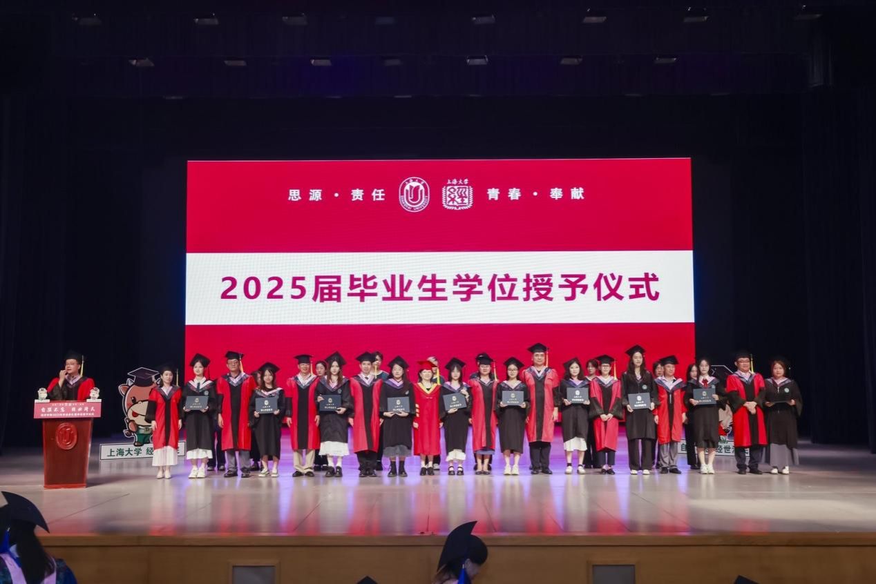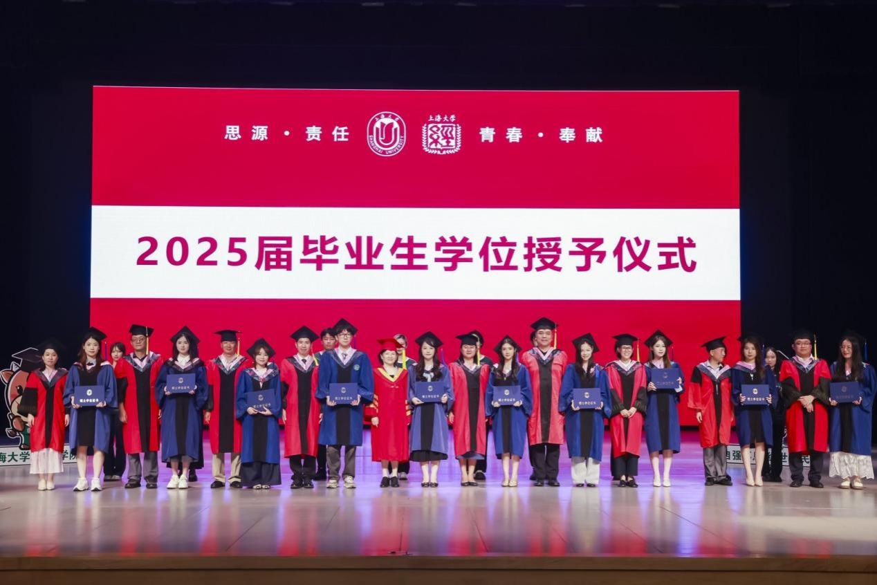 2025届毕业生学位授予仪式由党委副书记、副院长冯玉鑫主持,毕业生们依次走上舞台中央,主持人宣读出每一个毕业生的名字,上海大学党委常委、副校长聂清,院系领导及导师代表为他们拨穗正冠、颁发学位证书,合影留念。这一刻,所有的辛勤努力和付出都化作了脸上灿烂的笑容。毕业生们用坚定的步伐,迈向新的征程,展现了对未来的无限憧憬。各位领导在授予学位时,不忘与每位学生亲切交流,或叮咛嘱托,或微笑鼓励,现场氛围庄重而温馨。